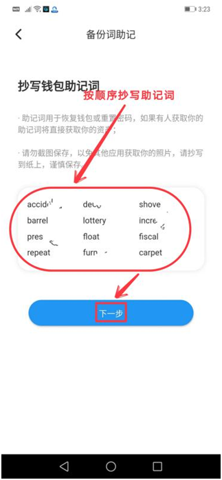 第七步、备份,抄写钱包助记词(注:助记词必须保存好,必须用纸抄写下来进行保存,单词之间留好空格)保存好后点击“下一步”,如下图: