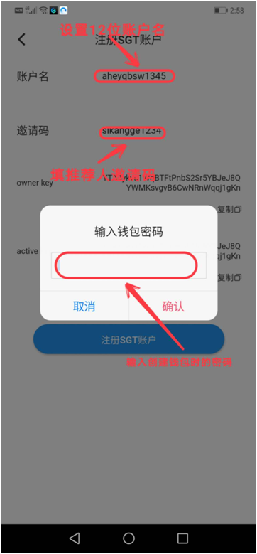 第十一步、填入“账户名”(注:请输入a –z与1-5组合的12位字节)如:abcd12345123;再输入推荐人的邀请码,点击“注册SGT账户”,如下图:
